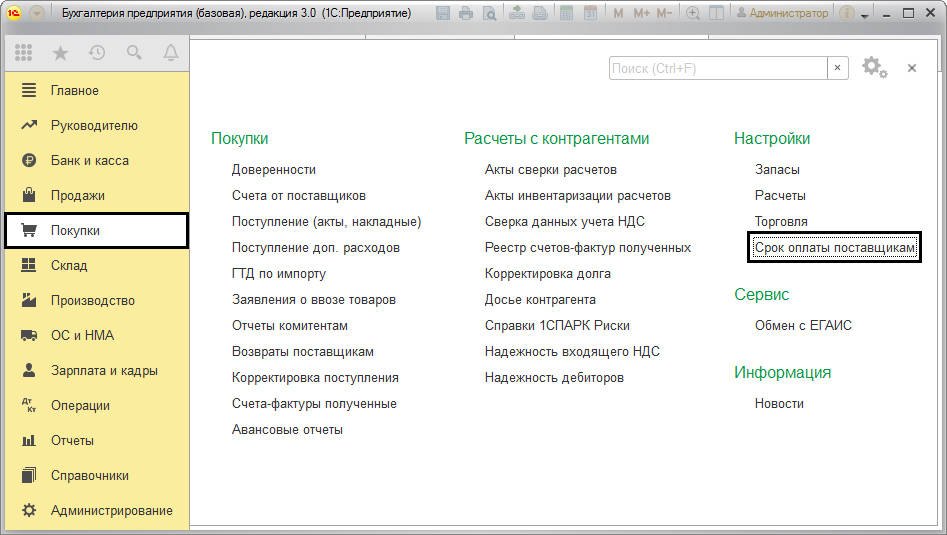 Аналогичным образом в меню «Покупки» в разделе «Настройки» можно задать сроки платежей поставщикам.