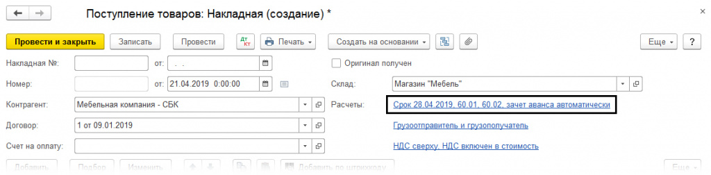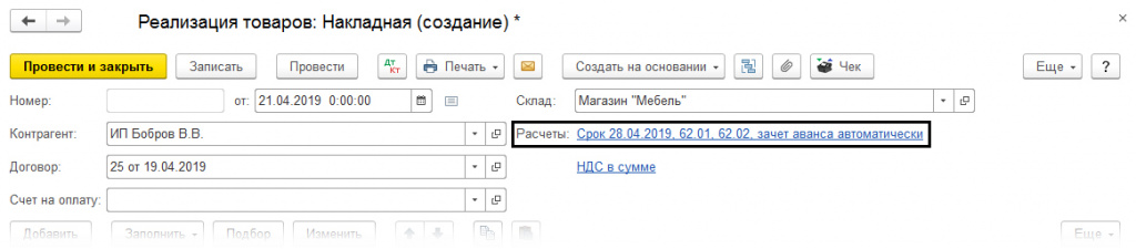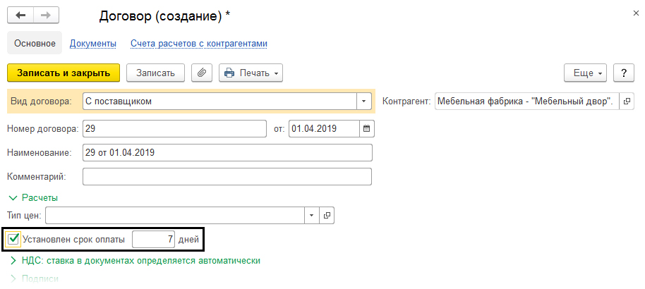 Еще один момент: сроки оплаты могут определяться договором – в этом случае в разделе «Расчеты» необходимо установить галочку в строке «Установлен срок оплаты».