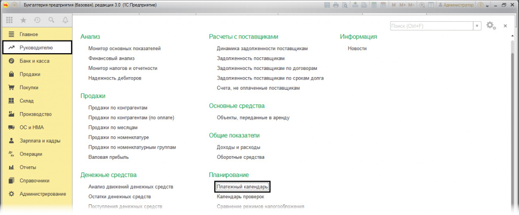 Опция «Платежный календарь» позволяет отслеживать планируемые поступления и расходы, а также остаток денежных средств. Располагается она в разделе «Руководителю» (меню «Планирование»).