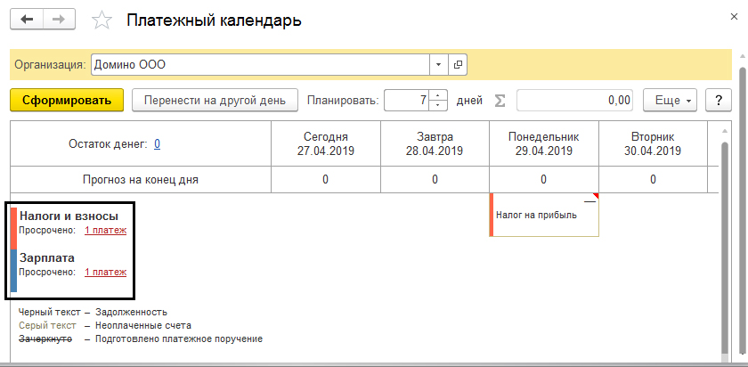 Стоит обратить внимание на следующий момент: для удобства пользователя и разделения задолженности, виды задолженности выделены разными цветами: зеленый – оплата от покупателей, желтым – платежи от поставщиков, красный и синий цвета – зарплата, налоги, взносы и иные обязательные платежи.