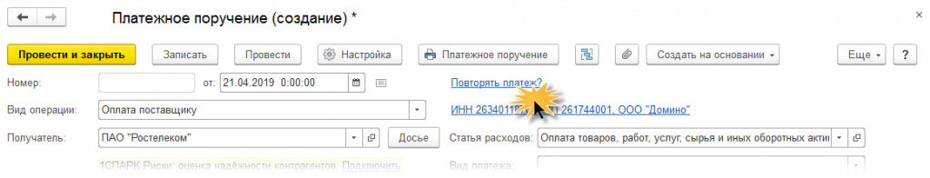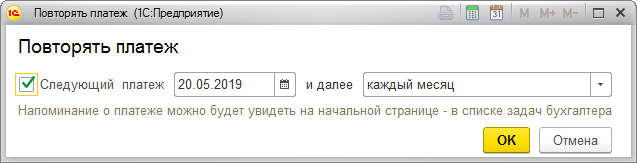 Весьма удобной опцией программы 1С: Бухгалтерия является возможность напоминания об оплате. Если у вас имеются платежи, которые совершаются в один и тот же срок (интернет, коммунальные платежи, аренда и т.п.), можно выполнить настройку оплат. Это можно сделать, выполнив в документе «Платежное поручение» настройки платежа (для этого нужно будет перейти по гиперссылке «Повторить платеж»).