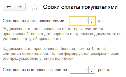 Здесь можно установить сроки оплаты покупателей для дальнейшего заполнения подобной информации автоматически. При этом не оплаченные своевременно суммы будут считаться просроченной задолженностью, если иной порядок расчетов не будет установлен в договоре или ином документе.