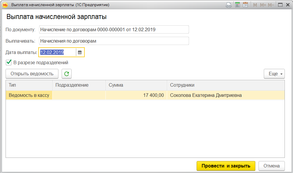 После этого в этом документе нажимаем на кнопку «Выплатить», «Провести и закрыть». Программа создаст ведомость в кассу.